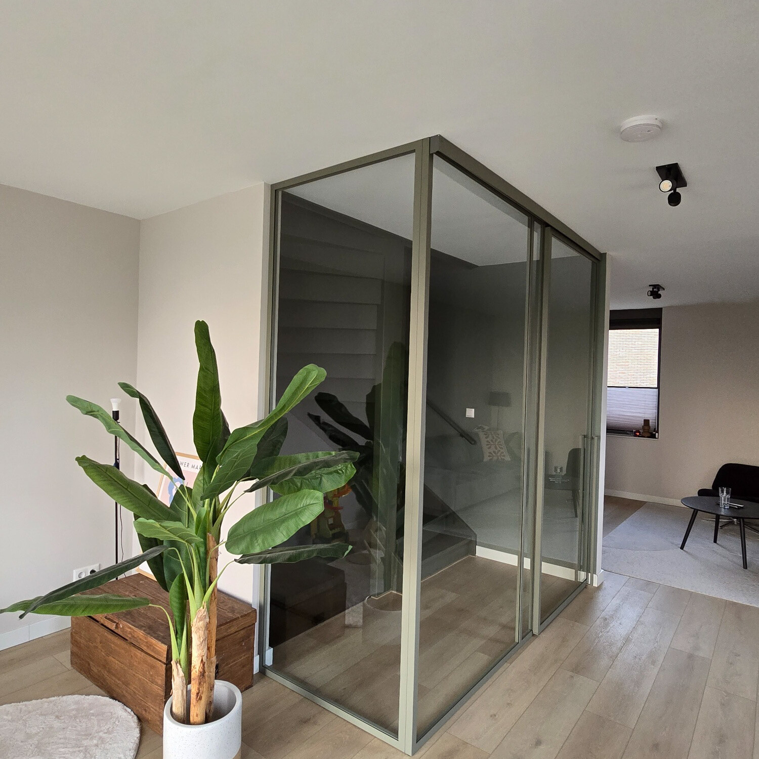 Wij passen diverse glassoorten toe, zoals helder glas, mat glas en rookglas. Rookglas zorgt voor een subtiele filtering van licht en geeft de trapgat deur een ingetogen en verfijnde uitstraling. Afhankelijk van de situatie kan het glas worden toegepast in volledige panelen of in combinatie met slanke stalen profielen.
