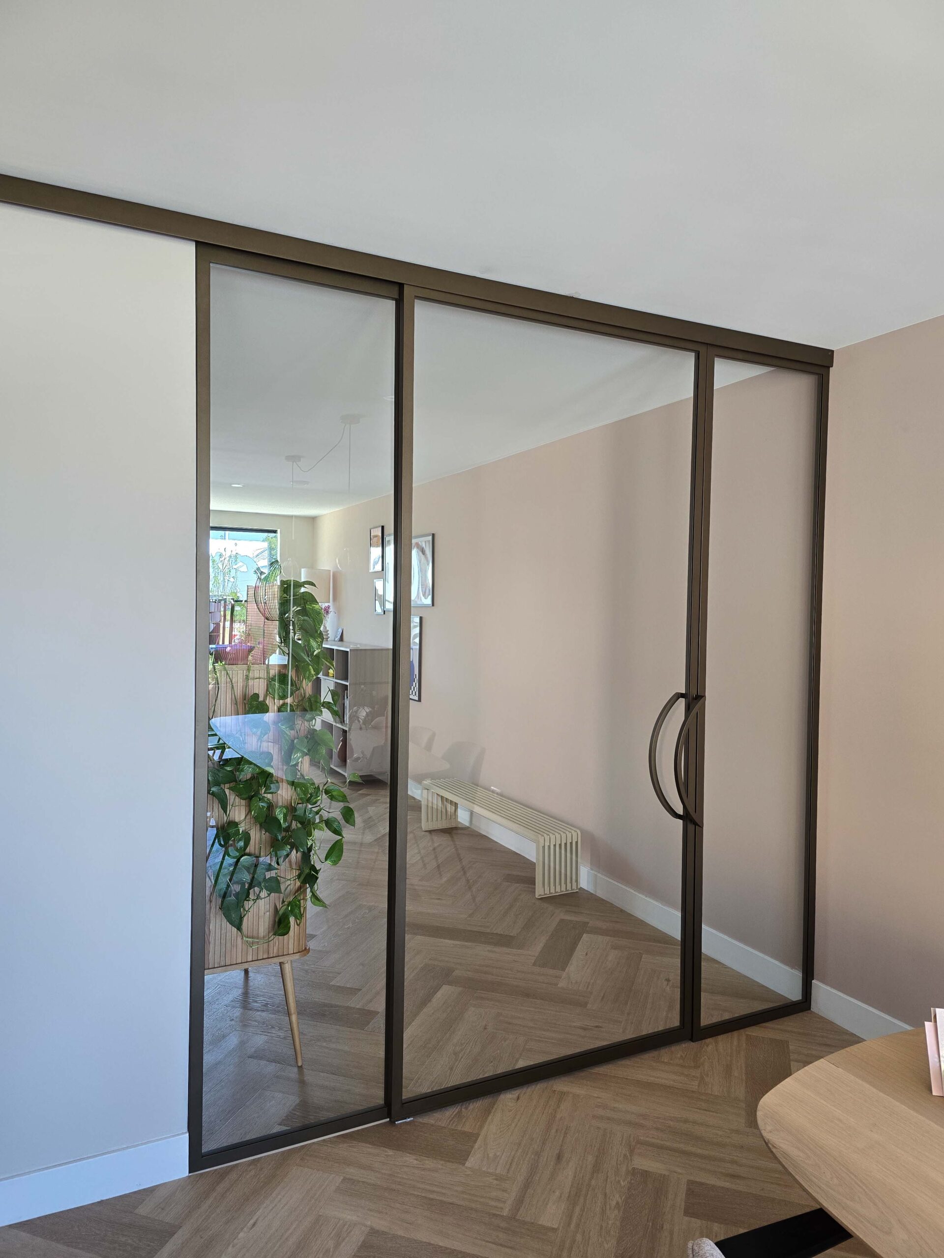 De schuifdeur met zijlichten vormt een mooie roomdivider tussen living en keuken. Door het minimalistische ontwerp zonder vlakken, geeft het geheel een rustig aanzicht.