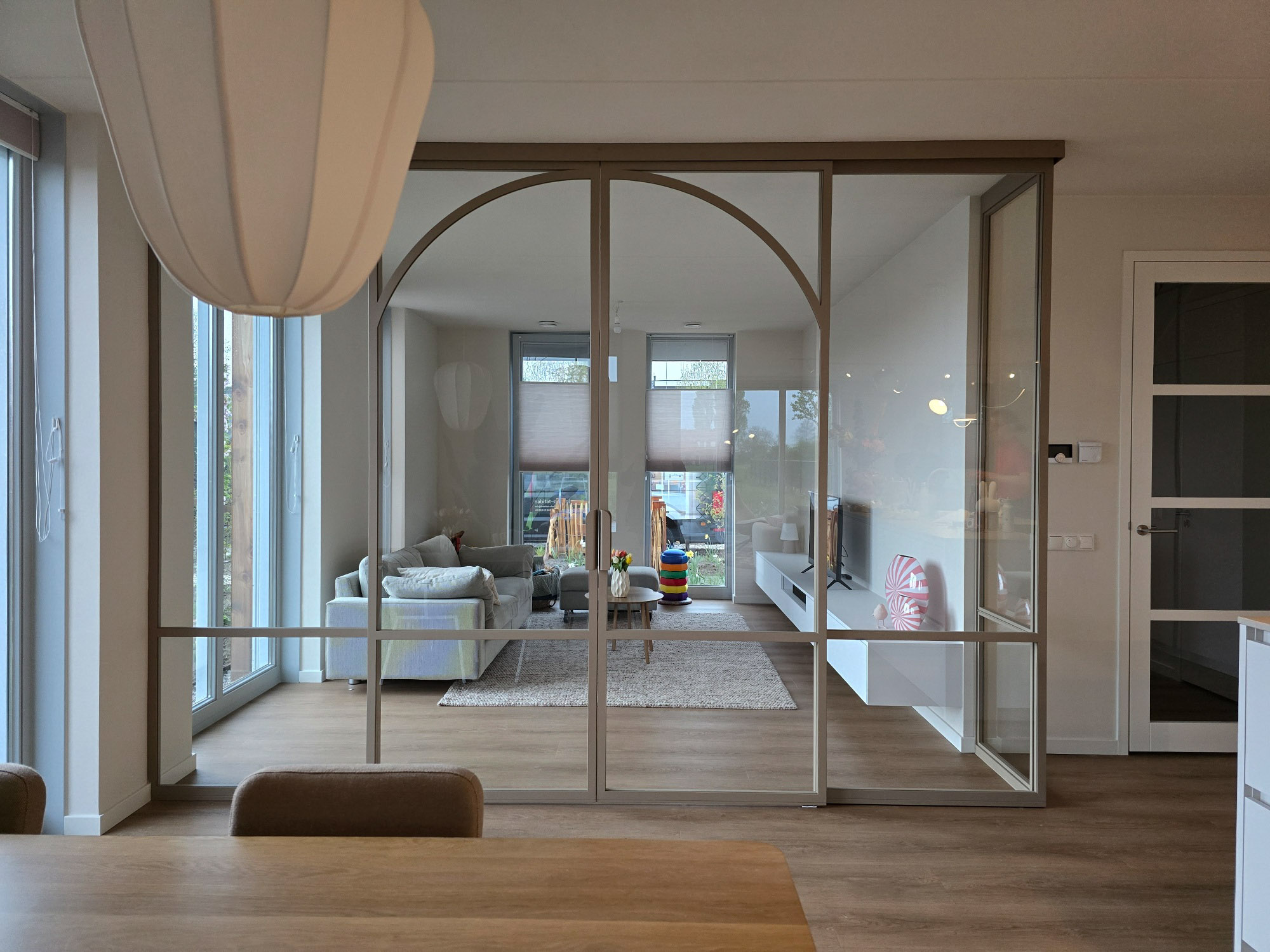 Deze brede roomdivider met hoek betrekt de zithoek bij de rest van de woning. Zonder verlies van licht worden geluid en warmte op de plek gehouden waar ze mogen zijn.