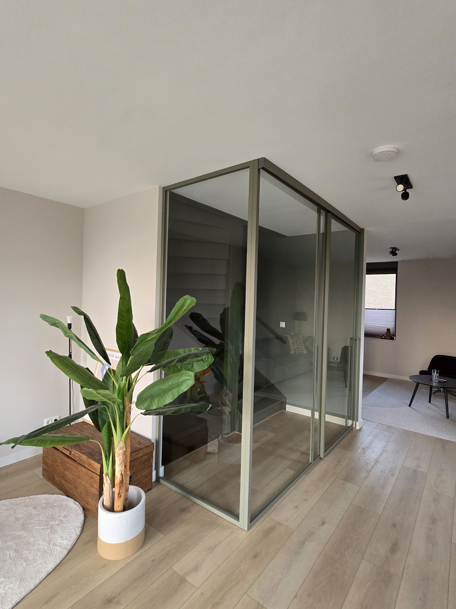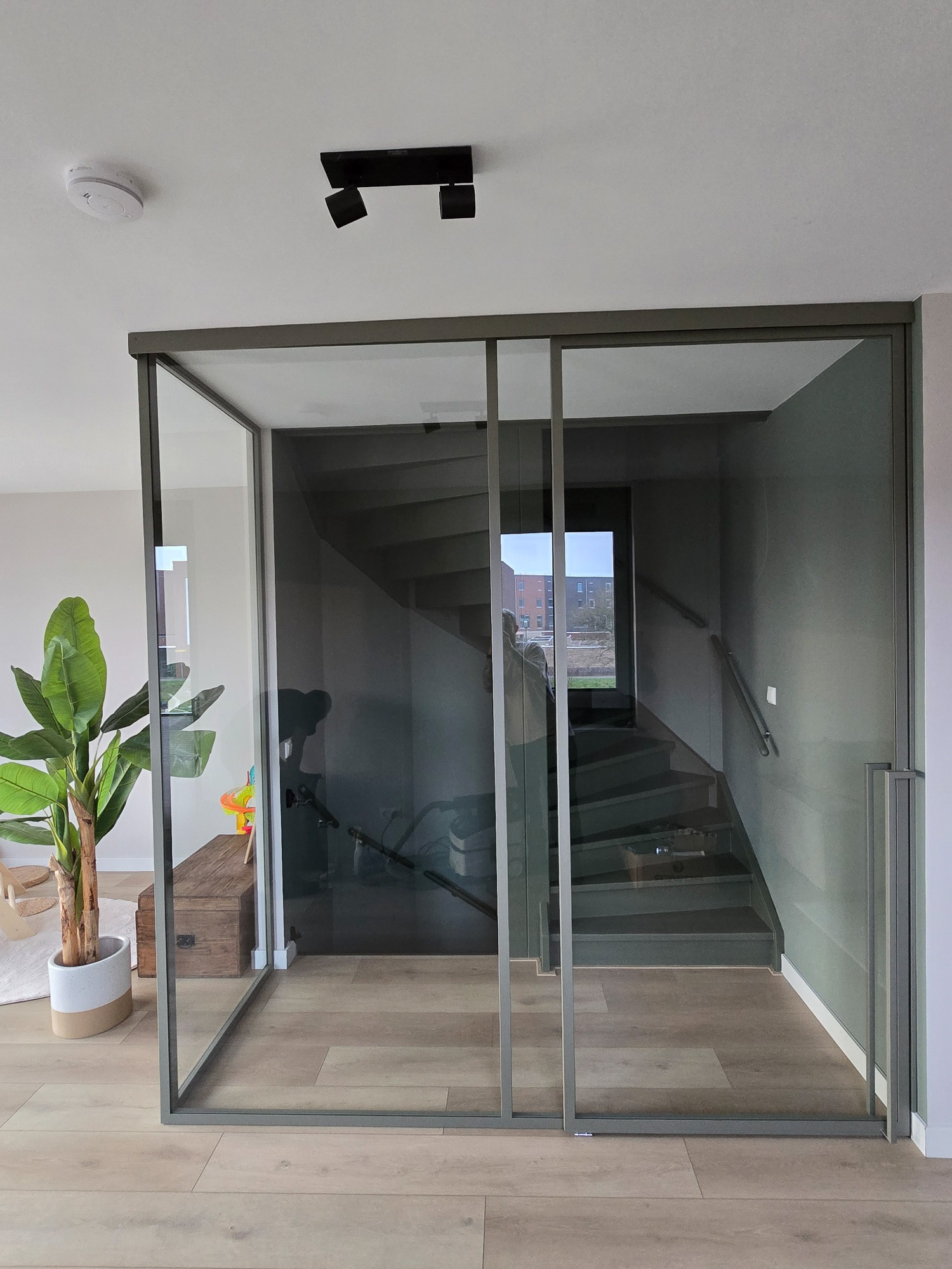 Het ruime portaal scheidt het trappenhuis met de woonverdieping. Door het minimalistische ontwerp zonder vlakverdeling en veel glas, oogt het geheel nóg ruimtelijker.