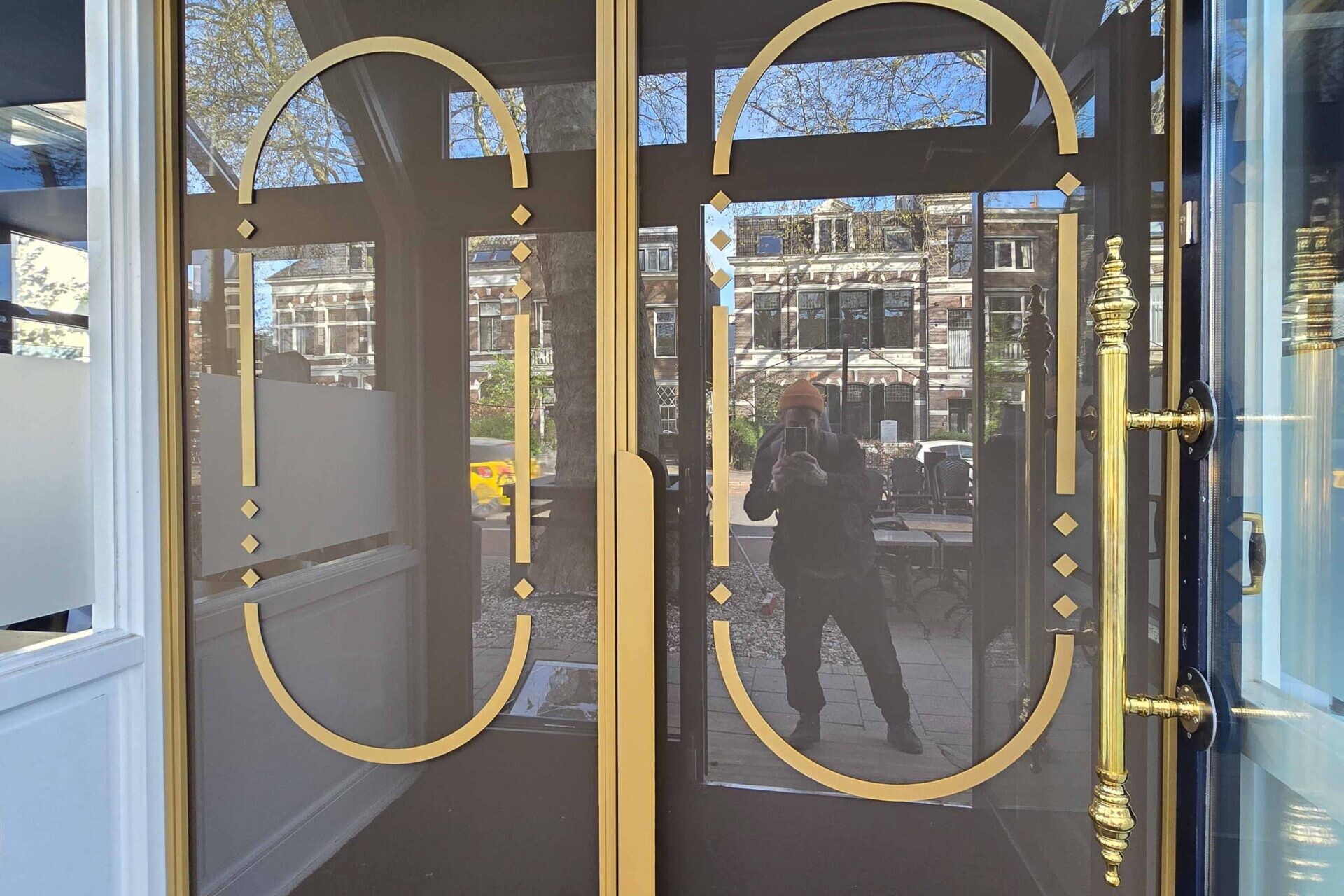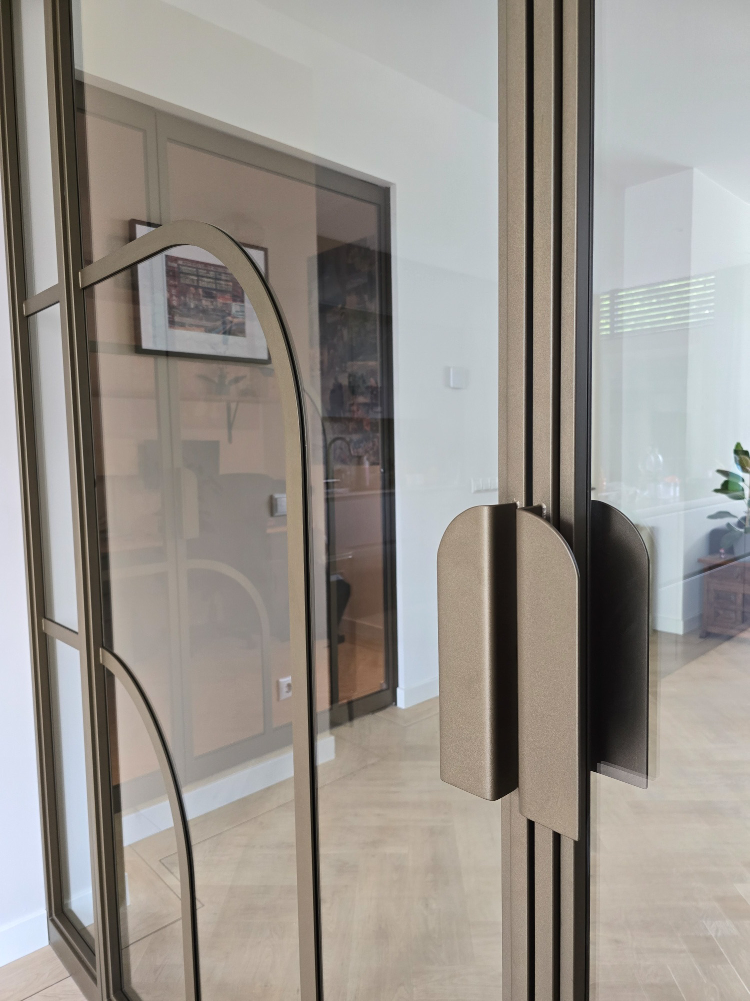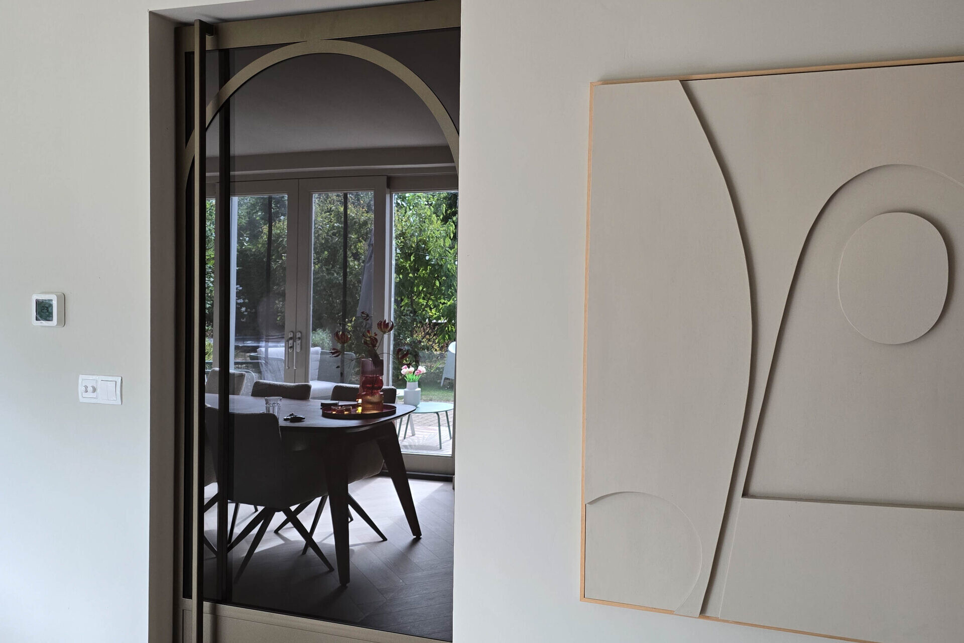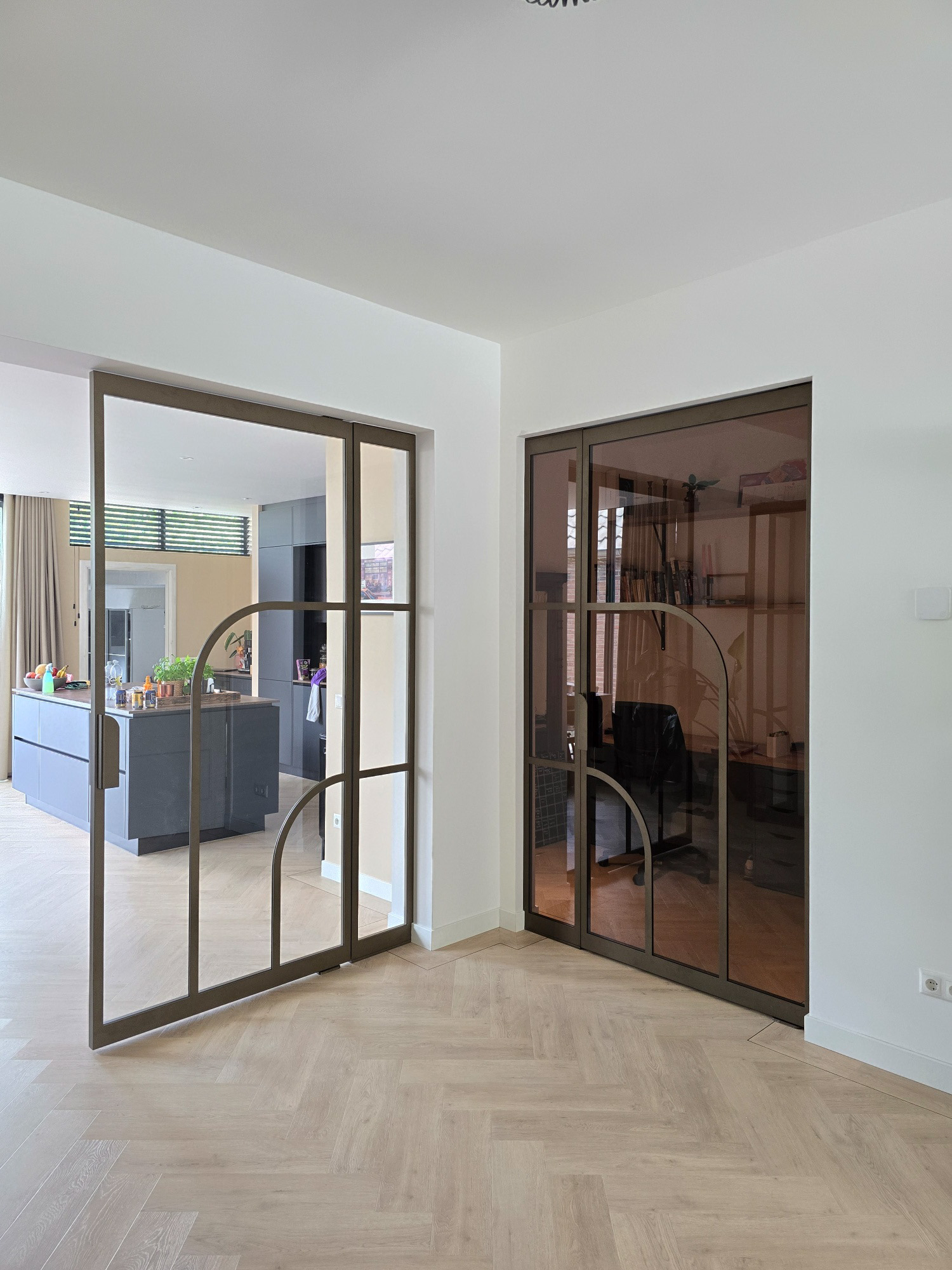 De grote roomdivider met dubbele taatsdeuren scheidt de voorkamer van de keuken en eetkamer. Geluid wordt tegengehouden, terwijl het licht blijft behouden. Om de voorkamer af te sluiten van het kantoor, is een taatsdeur met zijlicht geplaatst. Uiteraard met bijpassend ontwerp, maar uitgevoerd met bronze rookglas om de ruimte optisch meer te kunnen afsluiten.