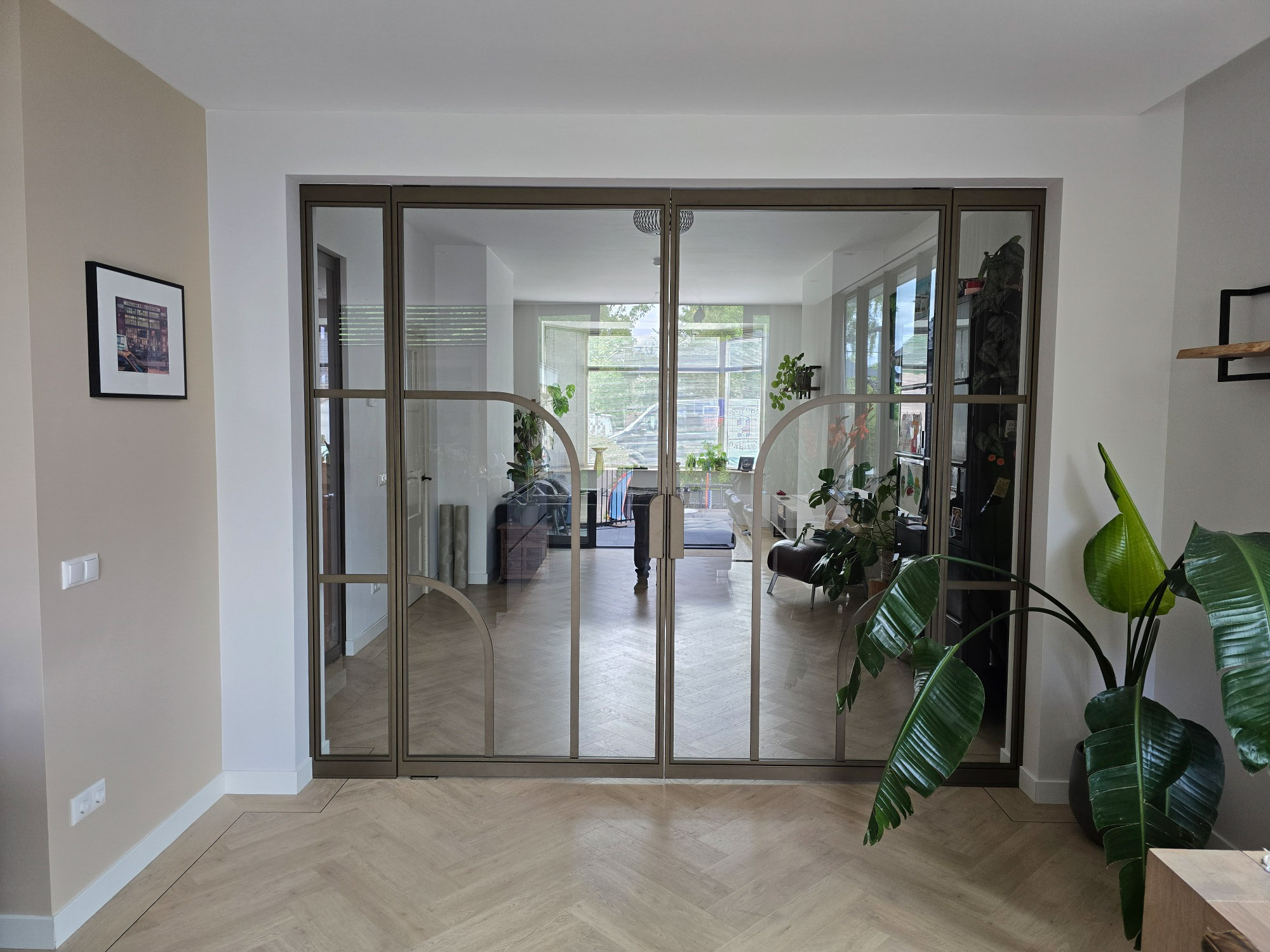 De grote roomdivider met dubbele taatsdeuren scheidt de voorkamer van de keuken en eetkamer. Geluid wordt tegengehouden, terwijl het licht blijft behouden. Om de voorkamer af te sluiten van het kantoor, is een taatsdeur met zijlicht geplaatst. Uiteraard met bijpassend ontwerp, maar uitgevoerd met bronze rookglas om de ruimte optisch meer te kunnen afsluiten.