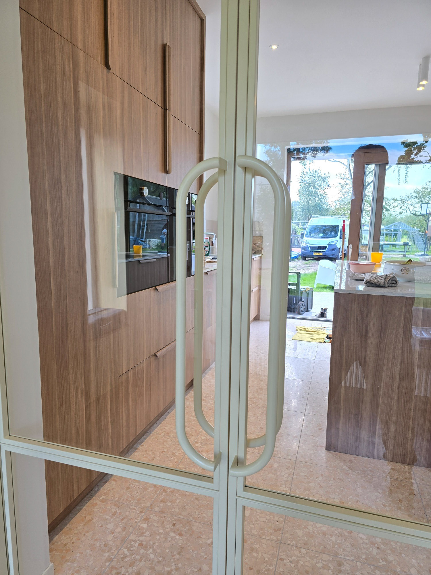 De deuren ensuite in lichte tint zijn voorzien van soft-open en -close, wat ze nog meer dat gevoel van luxe geven. De maatwerk grepen passen naadloos in het geheel.
