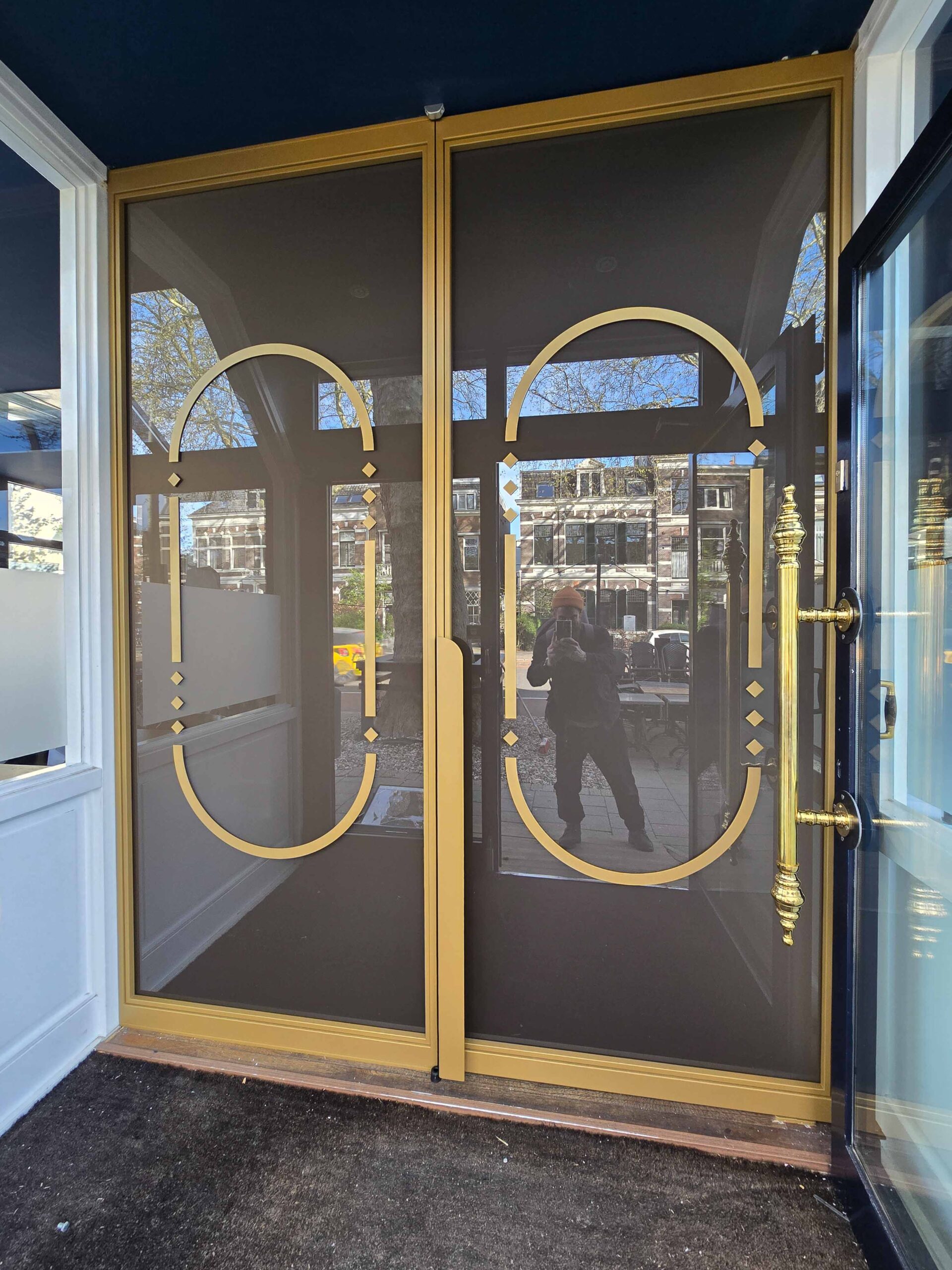 De taatsdeur en zijlicht zijn afgewerkt met bronze rookglas inclusief logo van het restaurant. Het geheel geeft een warme en luxe uitstraling én houdt kou en tocht buiten.